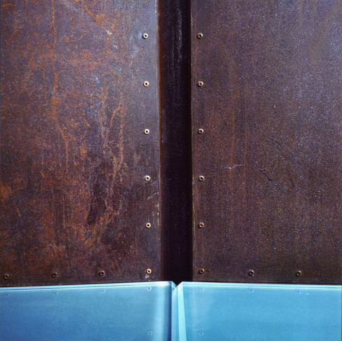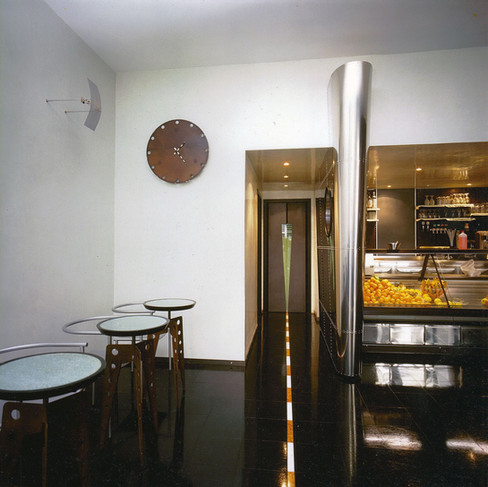 La progettazione di questo ambiente è tutta incentrata sulla contrapposizione dei materiali (il brutalismo della lamiera di ferro arrugginita in contrasto col nitore dell’acciaio inox lucidato a specchio, del vetro sabbiato, del marmo del pavimento e con la delicatezza dello stucco cerato delle pareti) e sulla ripetizione sistematica del tema del foro, usato sia come elemento decorativo sia come espediente a carattere funzionale. Un elemento divisorio carenato (interamente rivestito da lastre d’acciaio inox lucidato a specchio ancorate alla sottostruttura con centinaia di ribadini d’alluminio), definisce il passaggio verso il laboratorio e le toilettes; questo breve corridoio è enfatizzato da un intarsio lineare a pavimento di marmo bicolore inserito in lastre di nero assoluto. Una delle pareti della sala principale è costituita da due grandi pannelli convergenti in mezzeria interamente rivestiti di lastre di lamiera di ferro finite a ruggine frenata – ancorate alla struttura con rivetti in rame – che accolgono nella loro concavità una consòle di cristallo sabbiato, destinata alle colazioni in piedi, sagomata a spicchio di luna. Lampade a parete e tavolini sono stati eseguiti su disegno.