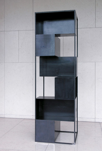 I contenitori, sempre uguali a sé stessi, e quindi identificabili come modulo-base, sono ricavati ciascuno da un unico foglio di lamiera di ferro ritagliata, piegata e saldata, e poi impilati l’uno sull’altro, secondo la disposizione più gradita all’utente (nell’esempio delle fotografie allegate è stata adottata una rotazione di 90° ad ogni salto di quota), all’interno di un volume prismatico definito unicamente da un’esile profilo metallico a sezione quadra (al quale i contenitori sono ancorati) che ne traccia spigoli e vertici. Ogni parte della libreria conserva la patina di calamina, che viene al ferro dal passaggio nell’altoforno, ed è finita a cera naturale.
