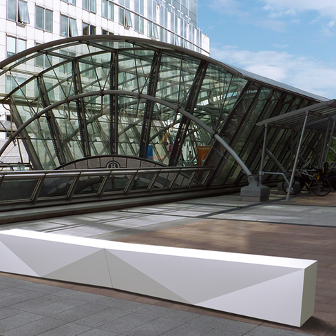 Questa panca è esplicitamente ispirata all’arte dell’origami: le piegature impresse su una lastra di ferro grezzo agiscono come nervature e danno volume e resistenza ad un semplice foglio di lamiera, generando una scatola rigida e sfaccettata, leggermente staccata dal suolo, su cui potersi sedere.